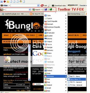 - Setelah proses penginstallan selesai pada mozilla sobat akan muncul toolbar TV-Fox. Silahkan klik pada Live TV by Country atau Live TV by Category untuk memilih chanel TV. Kira - kira screenshotnya seperti ini.
